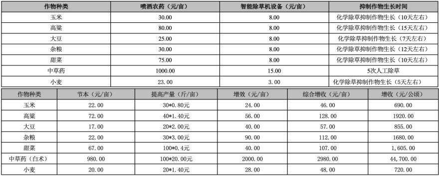 该机器人机型规格分为6行、8行、12行。如:6行机型可匹配70马力拖拉机,低油耗、高效率,适合长时间大面积作业。6行机器人每小时除草40-50亩,视觉识别杂草准确率近100%,杂草清除率 95%,伤苗率低于1%。该机器人配有夜视设备可以24小时连续作业,智能自动调控设定把握不同农作物除草的不同要领及操作场景。节能、省时、降低了成本,突破解决了农作物生态高效生产的瓶颈除草问题。
